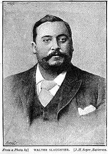 Slaughter's breakthrough success came in 1895 in collaboration with Hood with the musical comedy Gentleman Joe, The Hansom Cabbie as a vehicle for the low comic Arthur Roberts. Bernard Shaw dismissed the score in The Saturday Review: "The music, by Mr. Walter Slaughter, does not contain a single novel, or even passably fresh point, either in melody, harmony or orchestration."[10] However, the show ran for 391 performances and enjoyed a New York production the following year. This was followed in 1896 by another collaboration with Hood that produced The French Maid, which debuted at Terry's Theatre and was a long-lived international success (480 performances in London, and a long-running New York production), and the less successful Belinda. He also wrote incidental music to Henry James's Guy Domville (1895) and The Prisoner of Zenda (1896) around this time. In 1897, Basil Hood and Slaughter wrote a series of short children's musicals based on fairy tales that received warm reviews.[11][12]