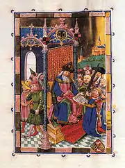 Emperor Charles IV enfeoffed Albert of Saxe-Wittenberg with the Principality of Lüneburg. 1442 illustration from the Lüneburg Sachsenspiegelhandschrift