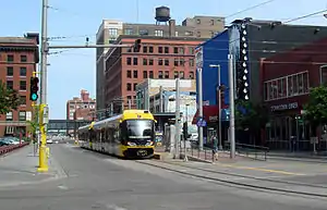 The Warehouse District/Hennepin Avenue station station is a light rail station on the Blue Line and Green Line in Minneapolis, Minnesota. This was the original northern terminus of the Blue Line until the new Target Field station opened on November 14, 2009 to provide access to the new Northstar Commuter Rail line.