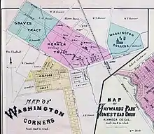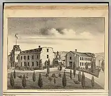 Washington College was founded in 1871 on a small hummock donated by E.L. Beard, located across from the C.P.R.R. Washington Corners depot, by the people of Washington Township as a scientific and industrial school. The founders were local landowners, educators and farmers, including W.F. Lynch, Albert Lyser, William Horner, Origin Mowry, H. Curtner, S.I. Marston, H. Crowell, and M.W. Dixon. The first building cost $30,000.[1] It opened July 1872 with the Reverend Silas Sykes Harmon and his wife as teachers. Two of their daughters later taught there; Rev. Harmon later started a school in Berkeley.[2][3][4] It was coeducational and nonsectarian; according to its catalog, "The idea is that young women should enjoy equal intellectual advantages with young men, and that they should be educated together." Courses were given in bookkeeping, calligraphy, commercial letter writing, Latin, Greek, and advanced English. By its third year of operation, it had an enrollment of 130 students from all over the state, only some of whom lived on campus in an impressive dorm, women on the first floor and men on the second, with a gymnasium for group exercise.[1][5] The Daily Alta California on August 13, 1875, reported another year of college overflow, necessitating the procurement of entire houses from the village to house the overflow students, and called for the construction of new campus buildings for housing.[6] Washington College continued as a nonsectarian coeducational academy for eleven years until 1883.[7]