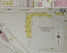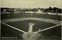 The second home of the Indianapolis Indians, from 1905 to 1931, is now referred to as the West Washington Street Park, but at the time was known as either Washington Park or Washington Baseball Grounds. The park was located at 1235 West Washington Street, just west of the White River (39°46′1″N 86°10′54″W / 39.76694°N 86.18167°W / 39.76694; -86.18167). Like its predecessor at Washington and Gray, this was a very rudimentary baseball venue with an all-wooden grandstand and a capacity of just over 4,000. In 1909 the park was completely rebuilt, and the seating capacity was enlarged to 20,000, the most in the minor leagues, due mainly to the addition of extensive bleacher sections. It also boasted the largest playing field of any minor league park, and was larger than many major league parks of the era. Aside from hosting the American Association's Indians, this venue was home to the Indianapolis ABCs of the Negro National League from 1920 to 1926.[1] The second ballpark also served as the home field for the 1911 Butler Christians football team.[2][3]