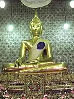 Moreover, the ordination hall is also a combination of Thai-Chinese architectural styles, which is majestic scenery. Within the ordination hall, the principal Buddha statue Maravijaya was enshrined, named "Phra Buddha Maha Logapinantapatima". This Buddha statue was cast in the royal foundry, along with the principal Buddha statue of the Wat Ratchanatdaram in Rattanakosin Island.[2]