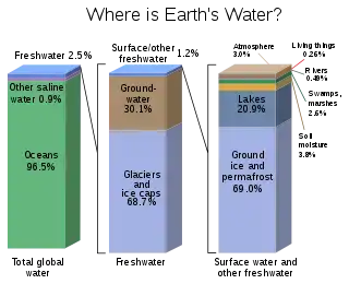 The total volume of water on Earth is estimated at 1.386 billion km³ (333 million cubic miles), with 97.5% being salt water and 2.5% being freshwater. Of the freshwater, only 0.3% is in liquid form on the surface.[2][3][4]
