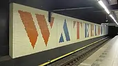 Waterloo by Willem Sandberg consists of blue and red letters on the platform walls spelling out the name of the work. The typographic artwork consists of basic shapes—circles, rectangles, triangles and trapezoids—with frayed edges.[29] The letters were planned to be removed during the 2016 renovation, as well as a few other artworks in different stations, as they were damaged. They were kept in the end due to their "cultural-historical value". Smoke screen panels were installed on the artwork to stop the spread of smoke in case of a fire.[30] The advertisements on the walls near the letters were also removed.[21]