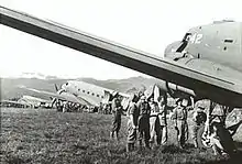 Unloading WWII transport planes at an advance airfield near Wau in 1943
