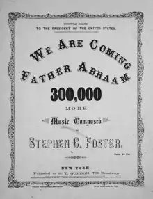 "We Are Coming, Father Abra'am", is a poem written by James S. Gibbons, set to music by eight different composers, including Stephen Foster. William Cullen Bryant published one version (with music by Luther Orlando Emerson (1820โ€“1915). Bryant's newspaper originally published the poem and, because it was originally published anonymously, many assumed it was his, and it was widely republished, so Bryant issued a statement denying his authorship. The poem and music came in response to a call by Abraham Lincoln on July 1, 1862 for volunteers to fight for the U.S. in the American Civil War. It was published in the New York Evening Post soon after, on July 16, 1862. [1]