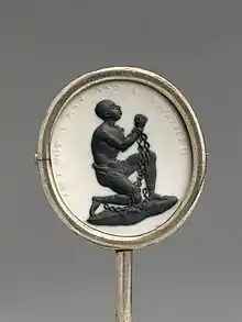 The Wedgwood anti-slavery medallion was an abolitionist symbol produced and distributed by British potter and entrepreneur Josiah Wedgwood in 1787 as a seal for the Society for the Abolition of the Slave Trade. The medallion depicts a kneeling Black man in chains with his hands raised to the heavens; it is inscribed with the phrase "Am I not a man and a brother?"[1][2]