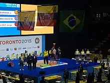 The General Motors Centre (Oshawa Sports Centre), in Oshawa, was the venue for the weightlifting competitions (pictured here during a medal ceremony)