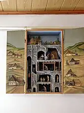 A Weihnachtsberg is a decorative, mountain-like model of the landscape of the Ore Mountains (between Germany and the Czech Republic), which is set up indoors during the Christmas period. It portrays the nativity scene and mining motifs as well as local themes. The figures and objects are often movable and mechanically driven.