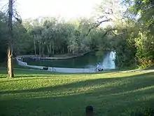 The headwater of the Wekiva River is the Wekiwa Springs, a second-magnitude spring located within the Wekiwa Springs State Park in Apopka. The spring has a mean discharge of 66.5 cu ft/s (1.88 m3/s) or 5,745,600 cubic feet (42,980,000 US gal) per day emanating from two vents, the largest of which is 35 by 5 ft (10.7 by 1.5 m) located 15 ft (4.6 m) under the water. A weir located about 270 ft (82 m) from the springs forms a 200-by-100-foot (61 by 30 m)-wide pool for swimming. At 170 ft (52 m) from the weir, the river widens into a trapezoidal pool about 430 ft (130 m) at its widest. The clear, bluish-green water narrows into a 60-foot (18 m)-wide run as it flows northeastward.[13][14]