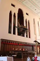 The Sanctuary is dominated by a large altarpiece – a hanging artwork referred to as a dossal. It was designed by Beverley Shore Bennett, and installed in 1990. It consists of three panels, in total measuring approximately 8.8 metres (29 ft) by 4.5 metres (15 ft). The centre panel depicts the Risen Christ; the two side sections contain symbols used in historic Christian art.[19]