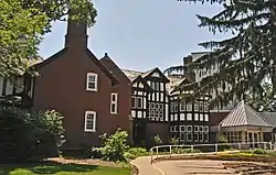 West Chester, also known as the D.S. Chamberlain House and Wesley Acres, is a historic building located in Des Moines, Iowa, United States. Designed by Boston architect William George Rantoul, it is considered an excellent example of Jacobethan Revival architecture in the city.[2][3] It was featured in a couple of publications after its completion. The inspiration for the house's design were the half timbered homes in Chester, England.[3] It features five gables and dormers on the main facade that rise above the ridged roofline and three tall chimneys with separate shafts for each flue.[3] There are two gabled wings on the south elevation of the house. The second floor has six bed & breakfast rooms.[3][4]