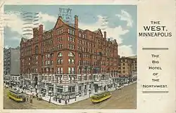 Opened in 1884, the West Hotel was Minneapolis's first grand hotel. It had 407 luxuriously furnished rooms, 140 baths, and featured an immense and opulent lobby which was claimed to be the largest in the nation. These elements combined to make what was considered for a time to be the most luxurious hotel west of Chicago. The West was designed by LeRoy Buffington and built on land that was once owned by the first resident of Minneapolis, John H. Stevens. Buffington created the West in the Queen Anne style that was quite popular in the last decades of the 19th century.
