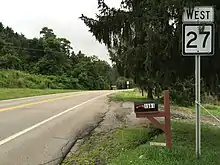 West Virginia Route 27 is an east–west state highway located within the Northern Panhandle county of Brooke in West Virginia. The western terminus of the route is at West Virginia Route 2 in Wellsburg. The eastern terminus is at the Pennsylvania state line five miles (8 km) east of Wellsburg, where WV 27 continues east into the border town of Independence as Pennsylvania Route 844.