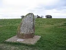 Although the horse is only presumed to commemorate King Alfred's victory at the Battle of Ethandun, an official monument to the victory was erected atop the hill, adjacent to Bratton Camp. The monument does not have an official name but is known as the Battle of Ethandun Memorial. It consists of a large sarsen stone (stone of remembrance) with a "pebbled" base, on which lies a metal commemorative plaque. The monument was unveiled 5 November 2000 by the 7th Marquess of Bath.[26]