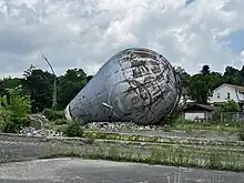 By 2015, the structure was in significant disrepair and was dislodged from its supports, due to vandalism and age.[23] On January 20, 2015, Silversmith had the atom smasher removed from its supports and laid on its side.[2] Workers laid bricks to brace the fall, and tipped it over.[12] In an email to the Pittsburgh Post-Gazette, Silversmith pronounced his continuing commitment to refurbishing and restoring the atom smasher, saying "The iconic Atom Smasher bulb survives."[23] As of 2023, the atom smasher remains at the demolition site, exposed to the elements.