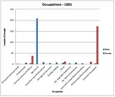 The occupations census data for 1881 in Wetheringsett-cum-Brockford gave 9 categories. In 1881, the total number of people with occupations was 509 and the most popular occupation was 'Agriculture'. 266 of the total working population were male and 243 were female. This working population was less than half of the total population of Wetheringsett-cum-Brockford at the time. The most popular occupation for males at this time, was 'Agriculture', with 208 males being employed. The least popular occupation for males was the 'Professionals' sector, with 1 male to 7 females. The majority of females came under the category of 'Unknown Occupation', indicating they may have been unemployed, along with 4 males. The second most popular occupation for females was 'Domestic Services Or Offices' with a total of 38. Aside from these two occupations, the number of females employed in any other occupation did not reach above 12.[11]