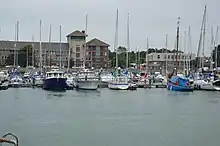 Weymouth Marina occupies most of the inner backwater of Weymouth Harbour, Dorset, England. The marina was refurbished to accommodate more vessels in the 1990s, and today houses hundreds of pleasure cruisers, fishing boats, yachts, dinghies and speedboats. Access to the marina is via a lifting road bridge across the harbour between Weymouth and Melcombe Regis.