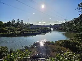 The Whau River (Māori pronunciation: [ɸau]) is an estuarial arm of the southwestern Waitemata Harbour (rather than a river) within the Auckland metropolitan area in New Zealand. It flows north for 5.7 kilometres (3.5 mi) from its origin at the confluence of the Avondale Stream and Whau Stream[1] to its mouth between the Te Atatū Peninsula and the long, thin Rosebank Peninsula in Avondale. It is 800 metres (2,600 ft) at its widest and 400 metres (1,300 ft) wide at its mouth.[1]