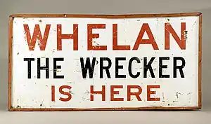 Whelan the Wrecker was a family owned and operated demolition company that operated from 1892 until 1992, based in Brunswick in the city of Melbourne. The company became well known through the 1950s and 1970s when signs stating that "Whelan the Wrecker is Here" appeared on many of the grand Victorian era buildings of Melbourne.
