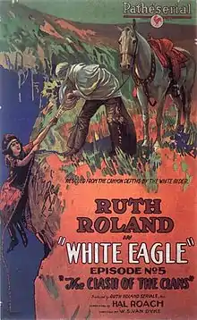 White Eagle is a 1922 American silent Western film serial directed by Fred Jackman and W. S. Van Dyke. The film is considered to be lost.[1] White Eagle is almost a remake of the earlier Ruth Roland serial Hands Up[2] The serial features a famous scene of Ruth Roland climbing a rope ladder from a moving train to a plane flying overhead.[2]