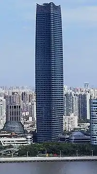 The White Magnolia Plaza, also known as Sinar Mas Center,[1] is a skyscraper whose construction was earlier suspended, but resumed construction in 2013, and was completed on January 4, 2017.[2] It is located north of the Bund, the historic river-front district of Shanghai, adjacent to the international cruise terminal. The original proposal called for a 388-meter (1,273-foot) tower, but it was later scaled down to 260 meters (850 feet), and then the third and final design was changed to 319.5 meters (1,048 feet).[3]