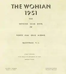 From 1927 to 1950, the school was without an official annual or yearbook. During the 195051 school year, under the leadership of teacher Mrs. Clyde Morton Ward, the first yearbook was published. The first edition was called "The WOHIAN".[4]