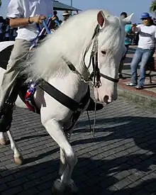 Despite this, some registries still refer to "albino" horses. For example, the Paso Fino Horse Association registers cremellos and other cream colors as "albino."[19] Until 1999, the American Quarter Horse Association (AQHA) described perlino or cremello horses as "albino" in rule 227(j).[20] The AQHA later replaced the word "albino" with "cremello or perlino," and in 2002 the rule was removed entirely. Among Connemara pony breeders, homozygous creams are called "blue-eyed creams" or sometimes "pseudo-albino".[21]