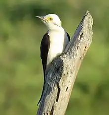 The white woodpecker (Melanerpes candidus) is a South American species of woodpecker (family Picidae) native to the wooded grasslands of Suriname, French Guiana, Brazil, Bolivia, Paraguay, Uruguay and Argentina. It is a bright white bird with black wings and a distinctive small bright yellow eye patch. The IUCN has rated it as a "least-concern species".