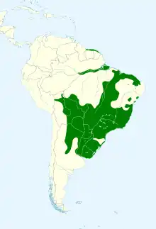 The white woodpecker has a large distribution in South America to the east of the Andes. Its range extends from Suriname and French Guiana, through much of Brazil to southeastern Peru, Bolivia, Paraguay, Uruguay and northern Argentina. It is found at altitudes of up to about 2,000 m (6,600 ft), and is non-migratory, but prone to making short distance movements. Its habitat is forest edges, open dry woodland, wooded savannah, scrubland with scattered trees, plantations, orchards, parkland and mangroves. It is opportunistic and adaptable, being seen in city suburbs, and expanding its range into areas of felled timber.[6]
