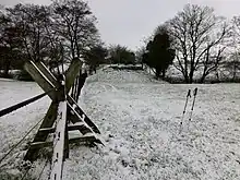 The route of the branch commenced on the north side of the level crossing in Grimsargh and curved sharply westward on a falling gradient into the deep cutting and on to the embankment before crossing Brabiner Lane.[8] The line then climbed on a gradient of 1:120 to the hospital grounds passing over a small accommodation bridge before entering Whittingham station.[7] A small coal storage area and engine shed existed beyond the hospital station[9] and the 1921 extension continued for 523 yards (478 m) across the hospital lawns, beside the fish pond, to the boiler house.[10]