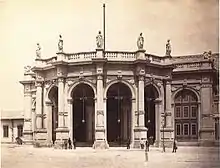 The growth of the city of Vienna also made the tributaries of the river more important for shipping. The station grounds are located in the Fahnenstangenwasser, a filled in arm of the Danube. At this branch of the Danube timber delivered via the river was unloaded. The flagpoles showed the landing stages to the ships and rafts. The site was a peripheral area of the Augarten belonging to the 2nd district. At that time, the Nordwestbahnstraße was still called Augartendamm. The branch of the Danube disappeared with the regulation of the Danube from 1868 onwards.[5] Thus land was won for the station and industrial companies. In the middle of the 19th century due to the lower taxes and the lack of space, public amusement opportunities were established outside the city walls. The area was also popular for carrying out illegal dogfights of rich industrial sons.[6] There were also large amusement centres. The most famous was the "Universum".[7] The owner Ferdinand Bachmaier (1826-1903) demanded the enormous sum of 100,000 florins as compensation for the railway construction.[8]