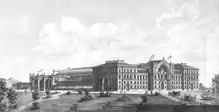 In the first planning phase around 1869, the project was the subject of numerous political and technical discussions. The focus was on the location between the regulated Danube river and Danube Canal, the elevation of the terrain and crossings for the local residents. Discussion points were how far the groundwater has to be taken into account, as the level of construction work has a significant impact on construction costs. Another point was the number and dimensions of the passageways underneath the station.[11] The structure was initially intended for the western (back) part of the Augarten, but this location would have hindered the connection between the Danube main stream and the city more than the finally selected location.[12] In mid-June 1869, a solution could be found next to the Taborstrasse, after complete reworking of the project.[13]