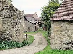 Wigmore Abbey was founded by Hugh de Mortimer and was first established at Shobdon in 1135, moving to Wigmore in 1160 and finally to Adforton in 1172.[1] Much of the abbey was destroyed in a Welsh uprising in 1221,[2] but was rebuilt by Edmund Mortimer in the 1370s.[3] Very little of the rebuilt abbey now remains, beyond some stretches of wall.[1] In the Middle Ages the abbey developed into the largest in Herefordshire and built a farm, called a monastic grange, to supply provisions.[3]