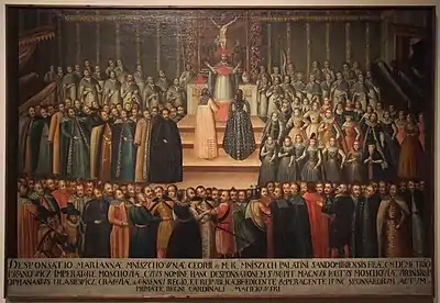 After Boris Godunov's death in 1605, False Dmitry I made a triumphal entrance into Moscow and was crowned tsar on 21 July. He consolidated power by visiting the tomb of Ivan the Terrible and the convent of Ivan's widow, Maria Nagaya, who accepted Dimitry as her son and confirmed his story.[9] In May 1606, Prince Trubetsky was "the first rynda in the white coat" to False Dmitry I during the receptions of the Sandomierz voivode Jerzy Mniszech and the Polish embassy under the leadership of Mikołaj Oleśnicki, and Aleksander Korwin Gosiewski.[10]