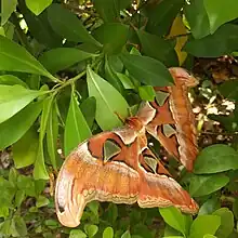 About 70% of the Philippines' nearly 21,000 recorded insect species are found only in the country. In addition, about one-third of the 915 butterflies found here are endemic to the country, and over 110 of the more than 130 species of tiger beetle are found nowhere else. One of the largest butterflies in the world and the largest in the Philippines, the Magellan birdwing, can be found here. The largest moth, the Atlas moth, can also be found in the Philippines.[3]