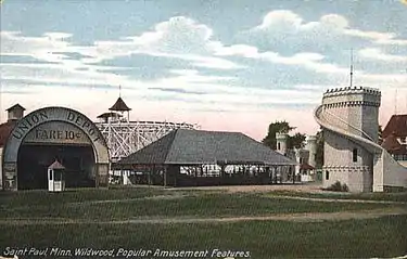 Wildwood Amusement Park was an amusement park and picnic ground that existed from 1889 to 1932 on the southeast shore of White Bear Lake in Mahtomedi, Minnesota, United States.[1] The park was built and operated by the Minneapolis and St. Paul Suburban Railroad Company, a subdivision of the Twin City Rapid Transit Company, which ran a streetcar line from Mahtomedi to nearby St. Paul.[2] It was the sister park of Big Island Amusement Park on Lake Minnetonka, as both were intended to draw crowds of people to opposite ends of the Minneapolis-St. Paul streetcar system on weekends.[3] Wildwood Amusement Park proved to be more successful than Big Island Amusement Park, which closed in 1911, and lasted until 1932 when financial losses brought about its demise.[4]