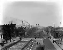 The 1916 station was built of brick and stone in the current Beaux-Arts architecture style with a vitrified tile waiting room[5]: 89 and monumental wooden benches. It served three 12-car-length island platforms with enclosed seating areas situated between three pairs of tracks (main and yard leads). Originally the platform surfaces were level with the floors of the railroad passenger cars,[4] but they were later lowered to the level of the track, reportedly due to substandard lateral clearances between the platforms and carbodies caused by the tracks' partially curved alignment when lengthier cars came into use; the change further spared train crews the inconvenience of having to lower and raise trap doors over the coach stairwells for this single station alone when platform levels of the other stations on this commuter route (possibly excepting East Liberty) were not elevated to match. One of the platforms was removed altogether. Access to the platforms was available by stairways at the Penn Avenue, South Avenue, and Franklin Avenue underpasses, in addition to the station tunnel which also served as the Ross Avenue pedestrian underpass. There was also a separate tunnel at the station to deliver mail, express, and baggage to the platforms (a U.S. post office was later constructed across the street from the station, forming a sort of civic center in conjunction with the municipal building/public library, also across the street). The station's strategic location visible down Ross Ave. was negated when that street's motor traffic was made one-way in the opposite direction.