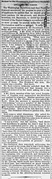 - ↑ "No Reception at the White House". Evening Star. March 2, 1866. p. 2. Retrieved 2023-06-26 – via Newspapers.com.