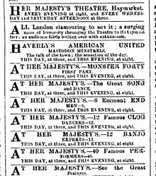 Huntley was especially engaged to play banjo for the blackface Haverly's United Mastodon Minstrels in London, and led the group's big banjo act in which twelve performers appeared at one time.[1][18][15] He gave a first performance at Her Majesty's Theatre on July 31, 1880 and remained three months.[1] During this period, Huntley had the honor of appearing before the Royal Family.[1] Afterward, he played in the principal cities of England and in Paris.[1] He left Europe later in 1880 and arrived in Memphis, Tennessee on December 30, to fill out his contract with Mr. Haverly's "New Mastodon Minstrels."[19]