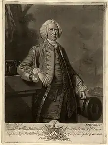 When the Seven Years' War began in April 1756, the French quickly occupied the island and began the Siege of Fort St Philip, which was commanded by Blakeney.[1] An attempt by Admiral John Byng to lift the siege was repulsed in May, and Blakeney surrendered on 29 June. The garrison was given free passage to Gibraltar, whose governor was Thomas Fowke, court-martialled but acquitted in 1746 for the defeat at Prestonpans.[19] In the inquiry that followed, Fowke was dismissed for failing to provide reinforcements from the Gibraltar garrison, while Byng was executed in March 1757.[20] The heavy drinking that left Blakeney with "a paralytick disorder" and "nervous tremors", was portrayed as the virtues of a simple soldier, but many considered his surrender premature.[21] Although rewarded by being appointed to the Order of the Bath and made 'Baron Blakeney' in the Irish peerage, delirium tremens left him barely able to write his name, and this ended his military career.[22] He died on 20 September 1761 in Ireland and later buried in the nave of Westminster Abbey; the gravestone still exists, but the inscription is now very faint.[23]