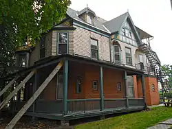 A rear addition was erected circa 1910. It has a stone foundation, brick first story, and wood shingle second and third stories. It features irregular massing, a variety of surface textures, multiple intersecting roofs, bay windows, porch and balconies, and a turret with spindle. The house was converted to apartments in 1925.[3]