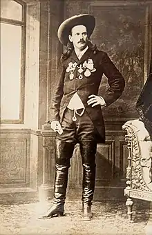 Carver migrated to California in 1876, where he honed his shooting skills. At about this time he coined the moniker "Evil Spirit," accompanied by a "camp-fire tale" that the name had been given to him by Spotted Tail, the famous chief of the Brulé Lakota, because Carver had felled a rare white buffalo.[4] In December 1877 the Evil Spirit issued a challenge to all comers; he would use a rifle and the challenger could use a shotgun, and the targets would be glass balls thrown from the newly invented Bogardus glass ball trap. He also contended that he could hit more targets from horseback than a challenger could hit while standing on the ground. One of the first significant awards Carver won was for breaking 885 glass balls out of 1000 in San Francisco on February 22, 1878. The gold badge was capped with the image of a grizzly bear and bore an inscription that proclaimed Dr. W. F. Carver the "Champion Rifle Shot of the World." Following his success in California, Carver recruited Texas Jack Omohundro, and the pair went on tour giving exhibitions of shooting prowess, with Carver demonstrating his expertise with the rifle while Omohundro displayed his proficiency with the pistol. These demonstrations included endurance contests as well as target competitions.[4] An article in the New York Times on July 6, 1878, illustrates the reception Carver received: