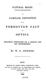 William George Horner (9 June 1786 – 22 September 1837) was a British mathematician. Proficient in classics and mathematics, he was a schoolmaster, headmaster and schoolkeeper who wrote extensively on functional equations, number theory and approximation theory, but also on optics. His contribution to approximation theory is honoured in the designation Horner's method, in particular respect of a paper in Philosophical Transactions of the Royal Society of London for 1819. The modern invention of the zoetrope, under the name Daedaleum in 1834, has been attributed to him.[1][2][3]