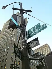 The corner of 5th Avenue and 48th Street in Manhattan, designated by the City of New York as "William Goldberg Way"