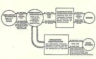 A syndicate of Philadelphia and Baltimore capitalists and banking houses was formed to underwrite the enterprise. Next an entirely different syndicate of banking houses was organized, which agreed to take the notes(when issued up to a certain amount) of syndicate No. I, the notes to be secured by the stock of a corporation organized to construct the plant. The corporation was capitalized at $2,000,000, half preferred and half common stock. All its stock was sold to syndicate No. I, for $1,000,000. Syndicate No. I then posted the stock and gave notes to syndicate No. II, who loaned the $1,000,000. Thus syndicate No. I was not called upon for cash, except for expenses, and the construction company was supplied with $1,000,000 with which to begin operations.[16]