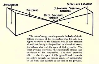 The base of one pyramid represents the body of stockholders or owners of the corporation who delegate their rights as owners to the directors, who in turn transfer all active authority to the president or other chief executive officer, who is at the apex of that pyramid. The other pyramid represents the subordinate officials and employees of the corporation. The chief executive officer is also the apex of this pyramid and transmits his orders through the various grades of subordinates to the clerks and laborers at the base of the pyramid. Thus responsibility and authority conferred by the stockholders and exercised over the employees are both centered in this chief executive officer. It is an organization almost ideally adapted, so far as efficiency and economy go, to the conditions of present-day industry.[12]