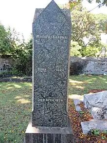 His remains were interred in an underground family vault at the cemetery of the Kawaiahaʻo Church.[7] The burial site later became known as the Kapiʻolani family plot where relatives of King Kalākaua, Queen Kapiʻolani and of Princess Elizabeth Kahanu Kalanianaʻole (including her parents) were buried. Today, an obelisk marks where the Kapiʻolani family plot is located.[13]