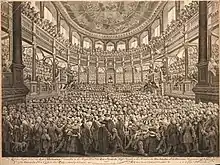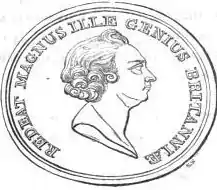 At the opening of the Radcliffe Camera, on 13 April 1749, King delivered a Latin speech in the Sheldonian Theatre. In it he expressed his Jacobitism: he introduced six times the word redeat ("that he may return"), pausing each time, amid loud applause. Thomas Warton, in his poem The Triumph of Isis, eulogised King's powers of oratory.[2] In praising the trustees of the library, King was complimenting Jacobites among them: the Duke of Beaufort, Sir Walter Wagstaffe Bagot, and Sir Watkin Williams-Wynn.[1] But one view is that the protest was no longer dynastic, being concerned with the Whig handling of the Church.[9] The audience included key supporters of the Hanoverian heir Frederick, Prince of Wales, who found also some signs of the Tory ground shifting.[10] Be that as it may, Jacobite propagandists lapped up King's themes, the invocation of Astraea in Virgil's terms of return, and the slogan "Redeat Magnus Ille Genius Britanniae" was adopted for use on the medallion marking the 1752 English covert visit of the Pretender.[11][12]