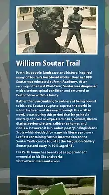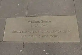 By 1930 Soutar was bedridden with his disease. He died in 1943 of tuberculosis contracted in 1929. He is buried in Perth's Jeanfield and Wellshill Cemetery.[8] His collected poems, edited by MacDiarmid, were published in 1948. His journal, The Diary of a Dying Man, appeared posthumously. One form of verse he used was the cinquain (now known as American cinquains),[9] which he preferred to call epigrams.[10] Interest in Soutar's work in Scots and English and for adults and children, has revived considerably since the 1980s, although none of his verse was in print for his centenary in 1998.[11] In 2014 he was the subject of a BBC radio programme: The Still Life Poet by Liz Lochhead.